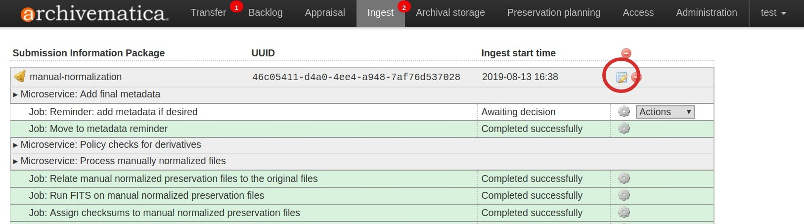 After normalization is approved, Archivematica will stop and remind you to add metadata. Click on the metadata icon.