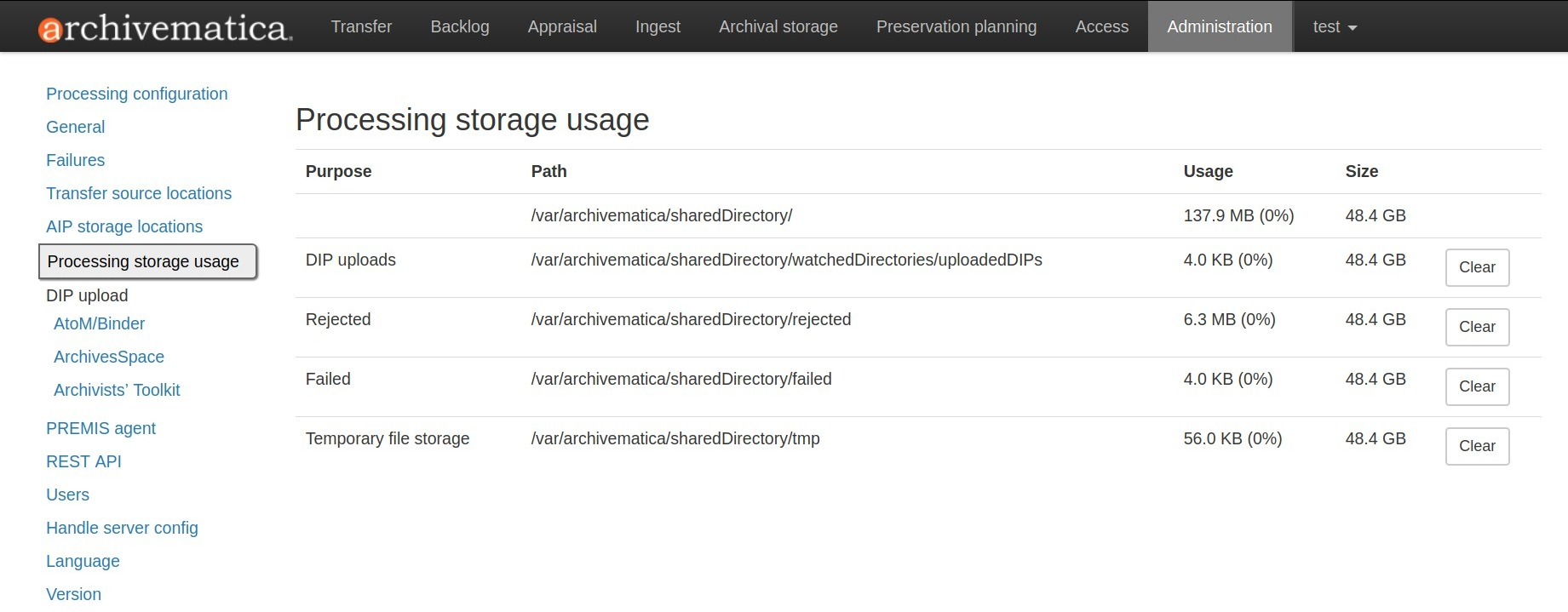Administrators can use the « clear » buttons to delete the contents of these processing locations to make more room on their server.