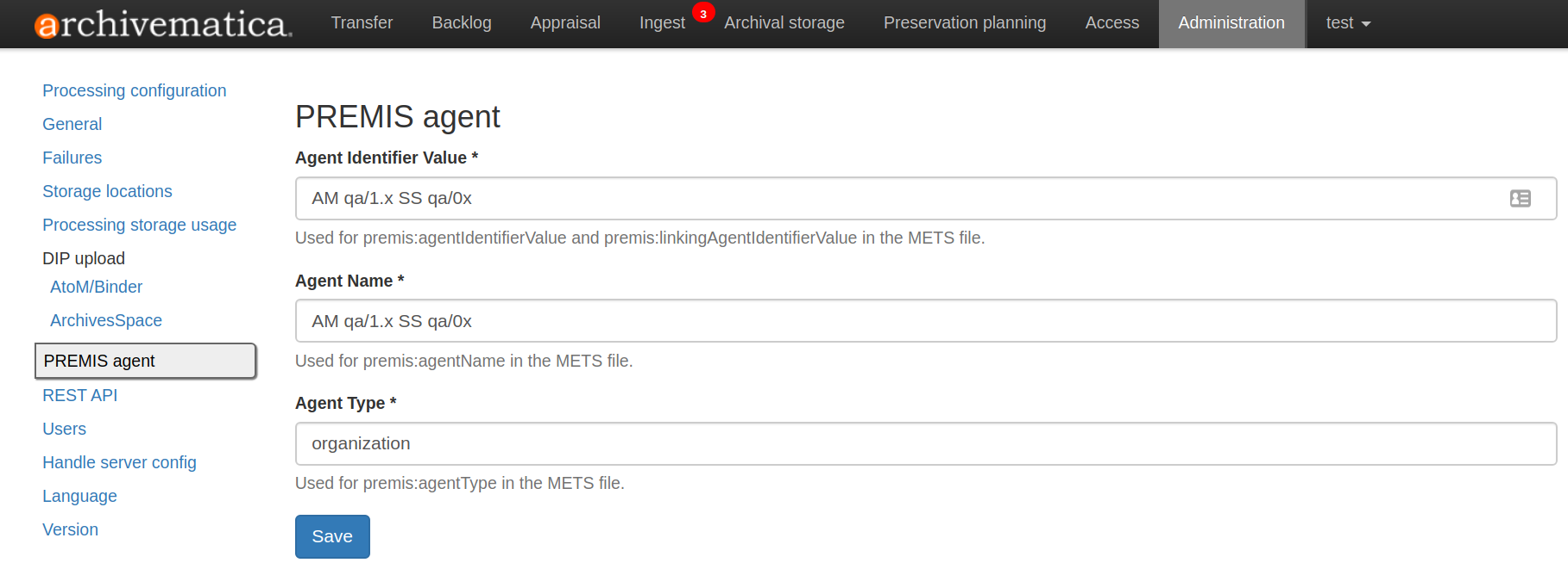Le nom et le code de l’agent PREMIS peuvent être réglés à l’aide de l’interface d’administration.