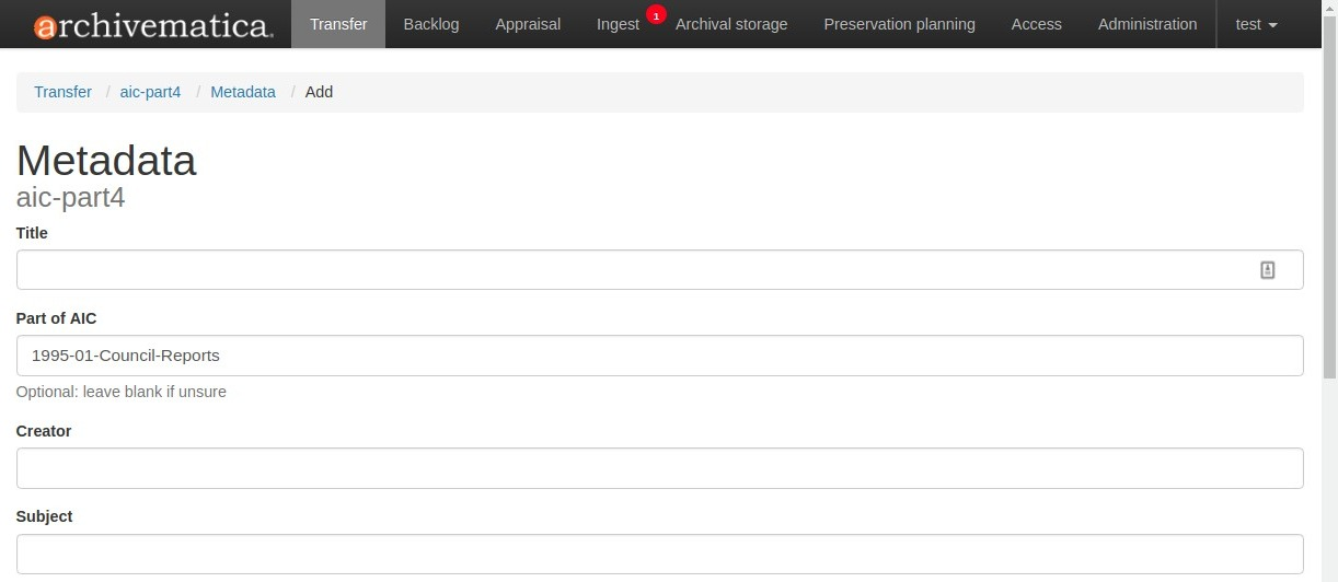 - In the Part of AIC field, enter the AIC identifier. You can also add other descriptive metadata for the transfer, if you wish.