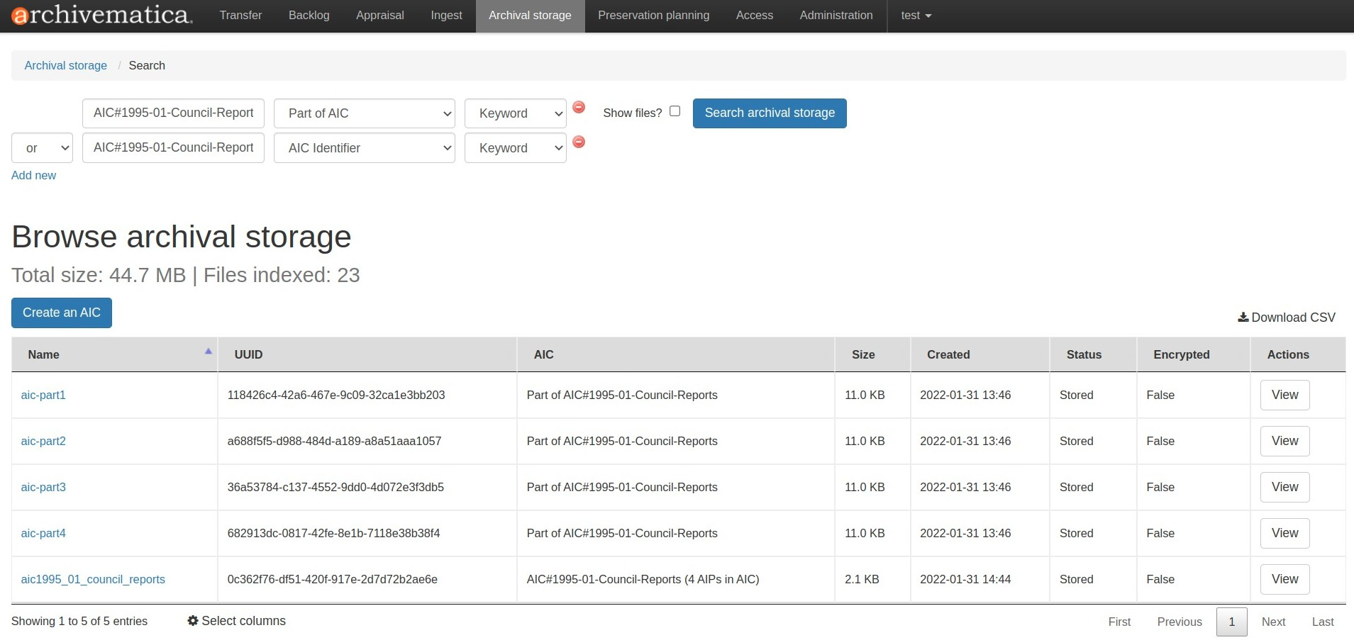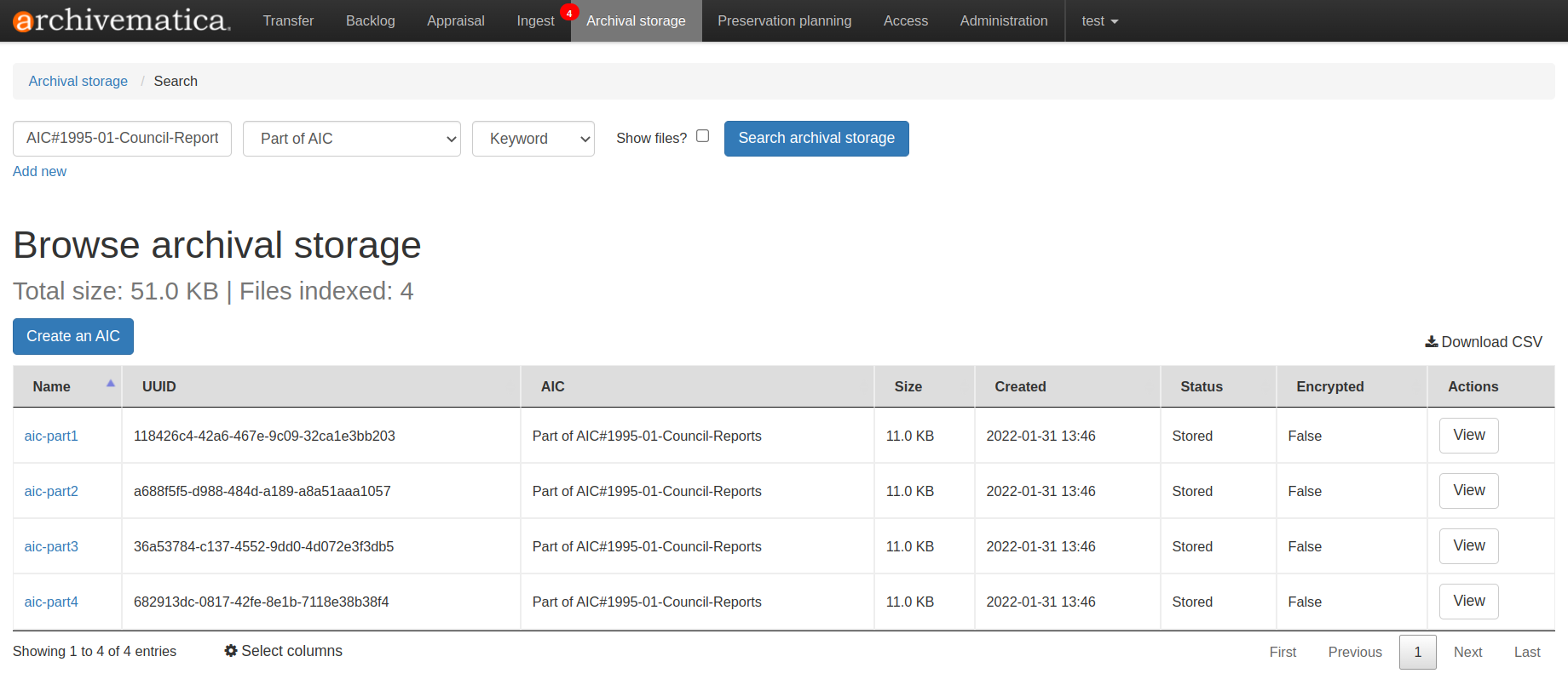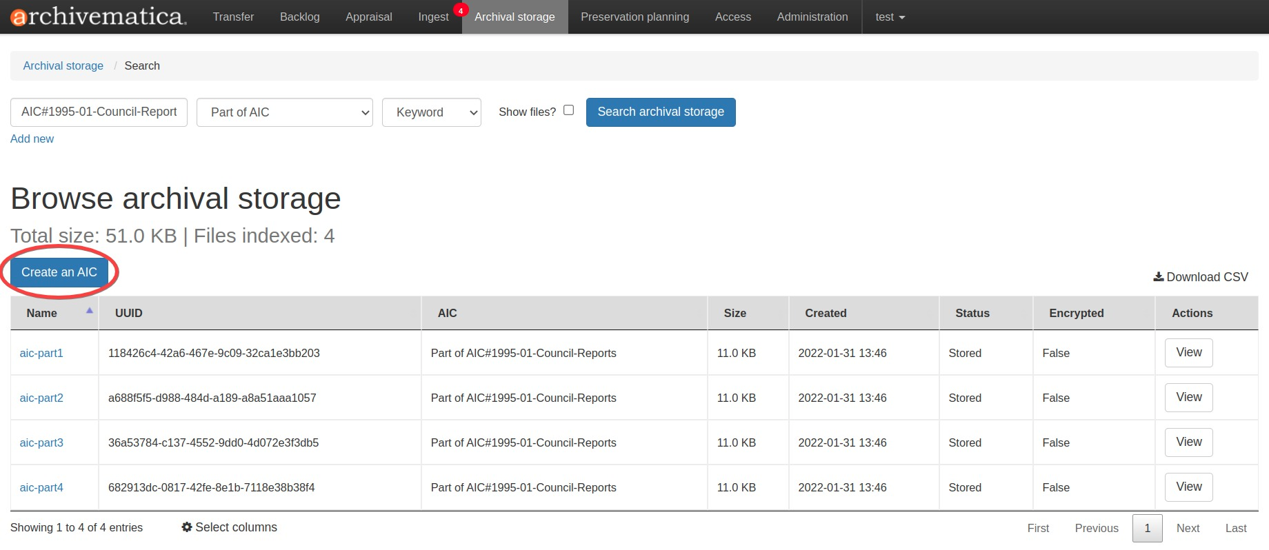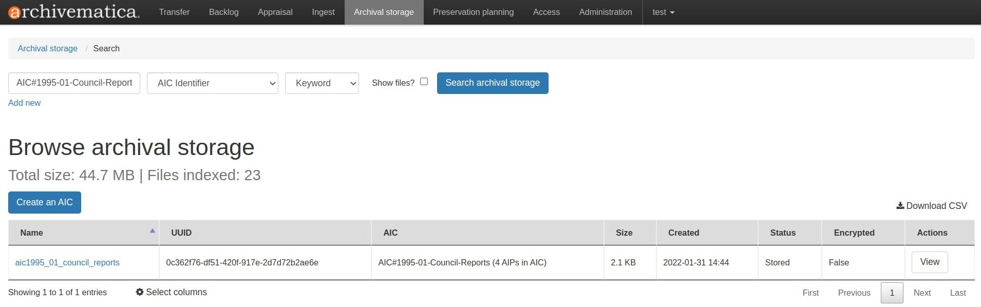 If you need to retrieve the AIC or any of the AIPs that make up the AIC, you can do so on the Archival Storage tab.