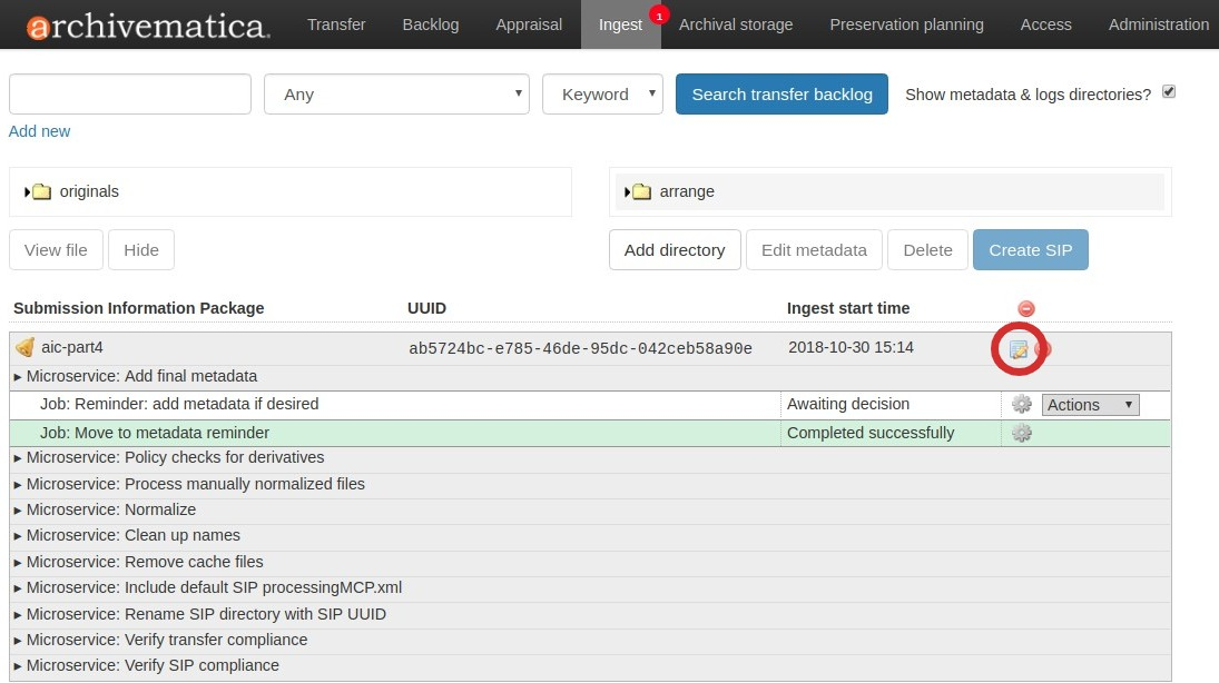 The method below adds some metadata about the AIC (an identifier) to each transfer before it becomes an AIP. This is optional, but it can be a helpful way to search for the AIPs that will form the AIC. If you do not use the AIC identifier, you must use some other method by which you can search for the AIPs that will be included in the AIC (i.e. the AIP name). Note that if you do not add an AIC identifier, it may be more difficult to search for the AIC’s component AIPs later.