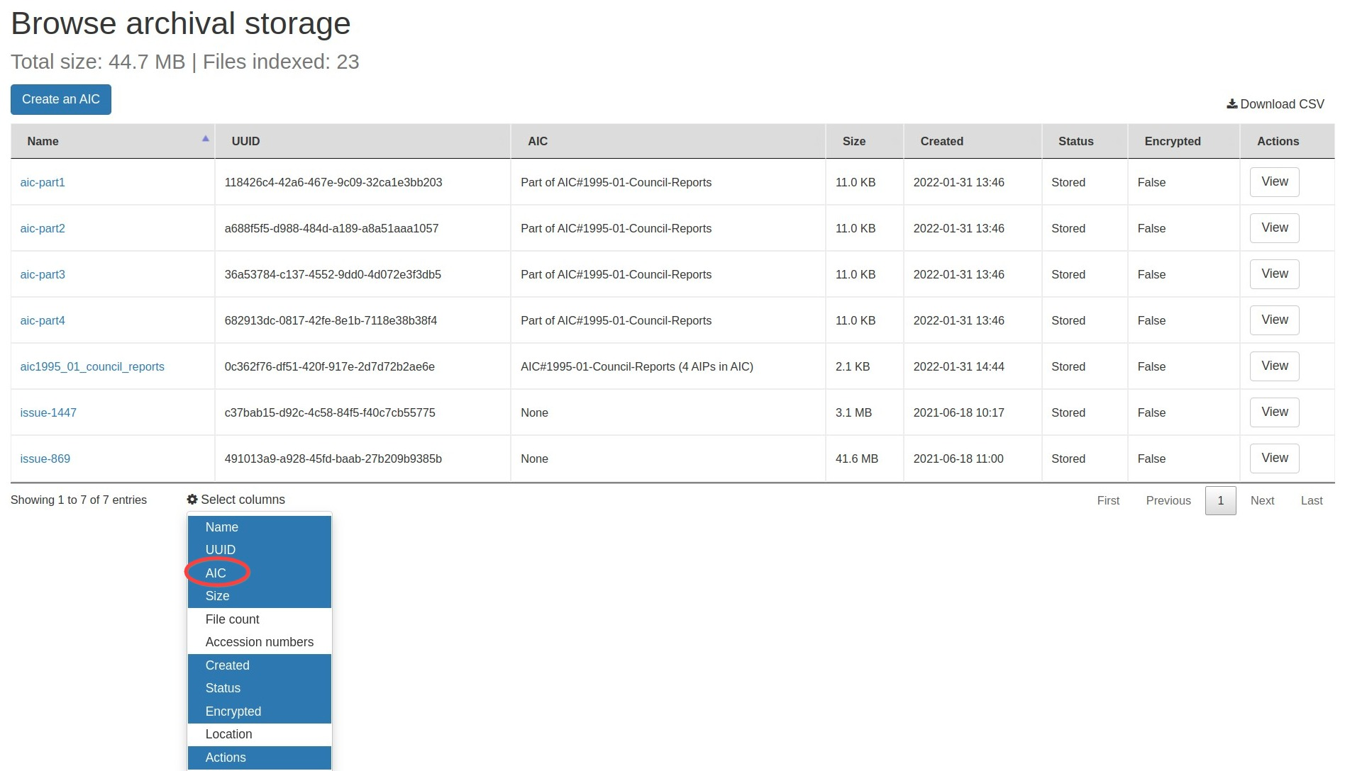If you did not create your AIC by adding the AIC identifier to each AIP, as described in Step 1 above, it may be more difficult to find the AIC’s component AIPs. You may need to download the AIC package and review the METS file contained within to see which AIPs make up the AIC.