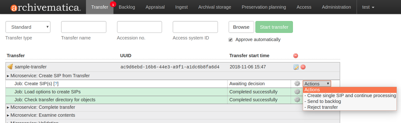 - Create SIP from transfer: gives users the chance to send the transfer to the Backlog tab, where it can be stored for processing later. Using the backlog also gives users a chance to carry out appraisal tasks. Alternately, the user can turn the transferred material into a SIP and send it along to the Ingest tab. The transfer can also be rejected at this point.