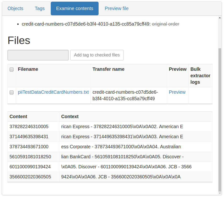 During the Transfer process, users can choose whether or not to Examine contents. This is a microservice that runs the tool Bulk Extractor, a forensics tool that scans the contents of a file to look for useful information. Bulk Extractor looks for many different patterns, such as social security numbers, credit card numbers, postal addresses, and email addresses.