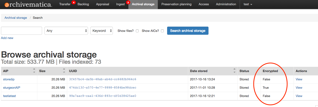 You can tell if your AIP is encrypted by looking at the Encrypted column of the table on the Archival Storage tab. Encrypted AIPs are marked as True.