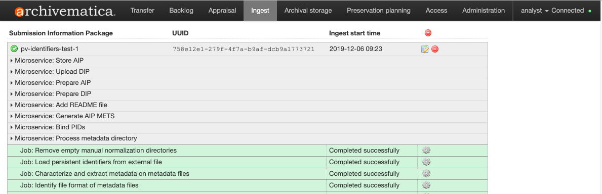 A transfer that is in the middle of processing will show which microservices have been completed (green) and which are in progress (orange). When a microservice fails or encounters an error, the microservice background turns from green to pink and a «failed» icon appears next to the transfer or SIP name. See Error handling for more information about how to handle an error.