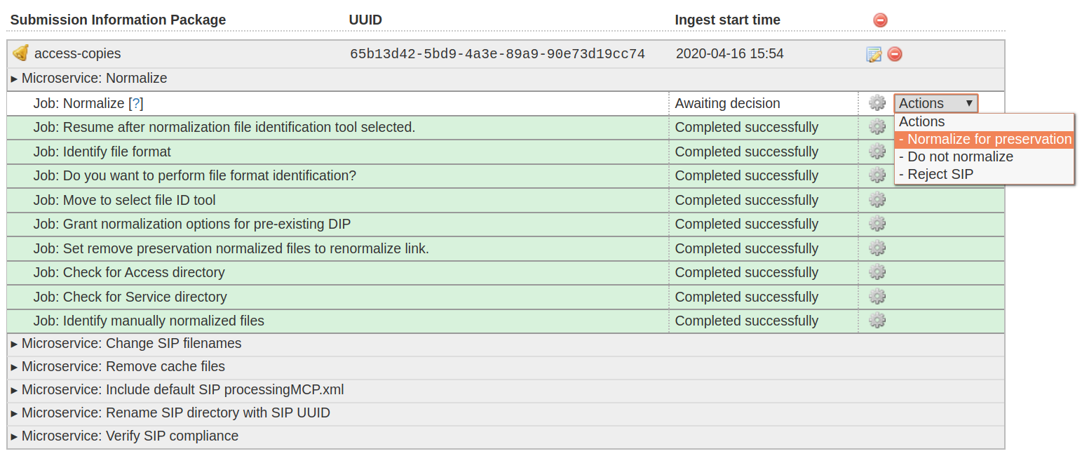 When you process this transfer, Archivematica will automatically recognize the existence of the access copies. At the normalization microservice on the Ingest tab, fewer normalization options will appear because Archivematica will always make a Dissemination Information Package (DIP) from the provided access copies.