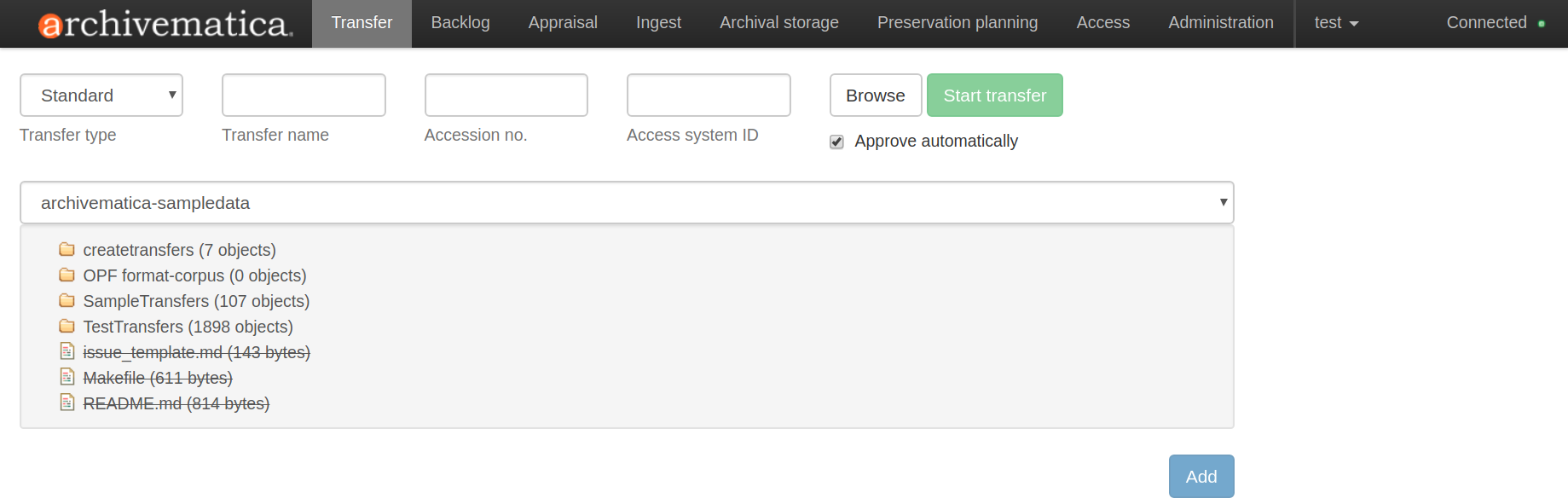 - Browse: The Browse button toggles open the transfer browser. This allows users to view and browse through the configured transfer source location(s). For more information about setting up transfer source locations that Archivematica can access, see Administrator manual - Storage Service. Selecting a directory and clicking Add adds the directory of materials to the transfer.