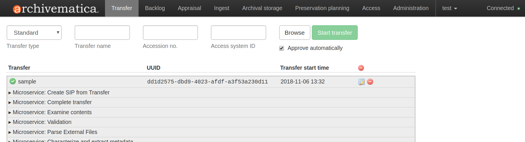 Once a transfer has been started, it appears below the transfer preparation area. Several microservices run on the transferred material to prepare it to become a SIP. The list of microservices should be read from bottom to top.