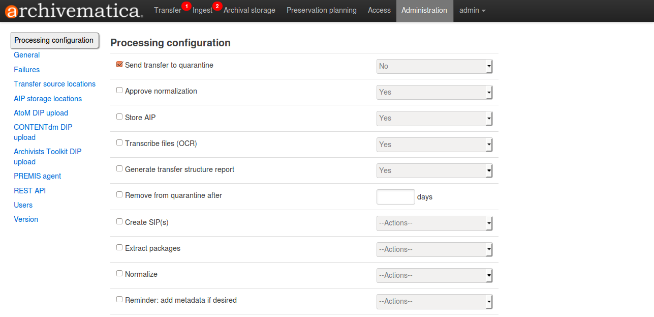 The Archivematica administration pages, under the Administration tab of the dashboard, allow you to configure application components and manage users.
