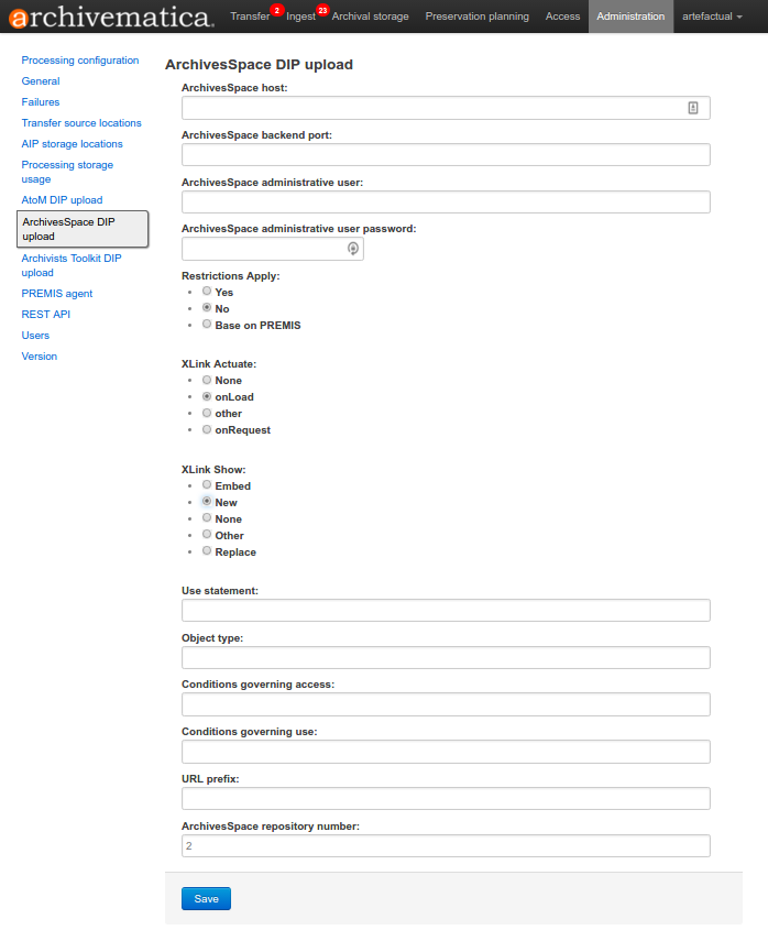 - ArchivesSpace repository number: Insert the identifier for the ArchivesSpace repository to which you would like to upload DIPs here. Note that the default identifier for a single-repository ArchivesSpace instance is 2.