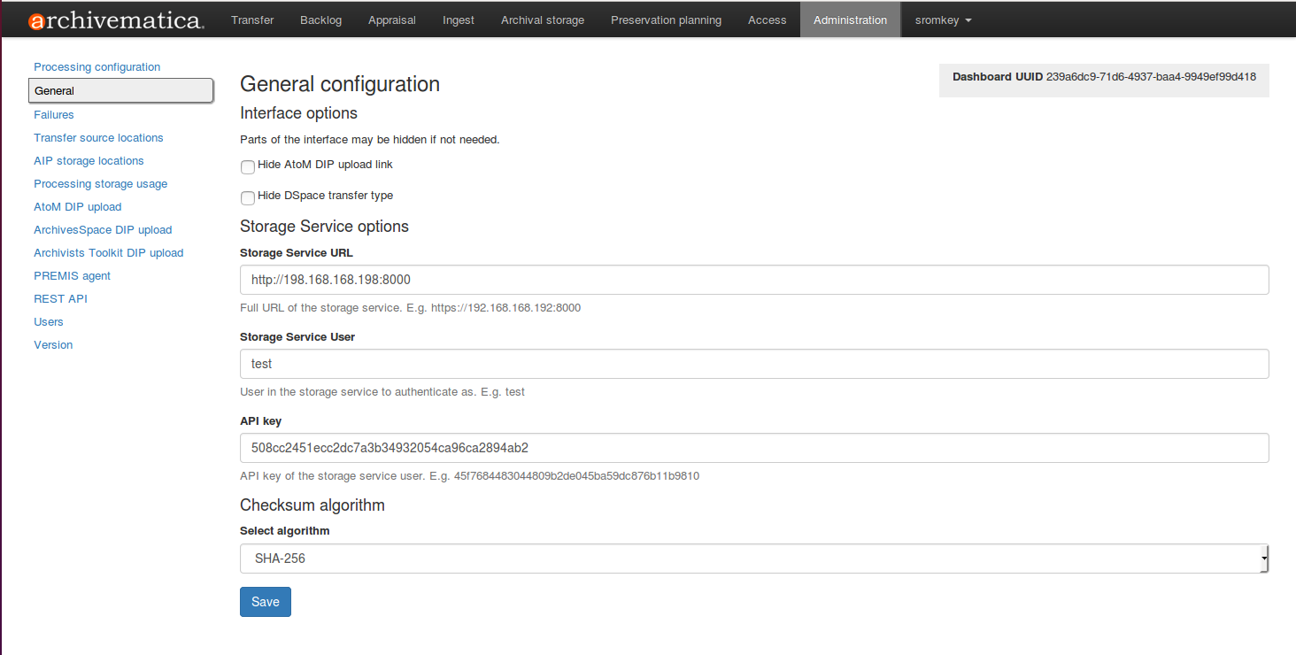 In the general configuration section, you can select interface options and set Storage Service options for your Archivematica client.