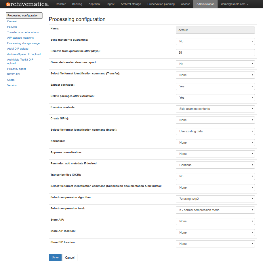 The processing configuration administration page of the dashboard allows users to configure the job decision points presented by Archivematica during transfer and ingest. This screen provides you with an easy form to configure the default processingMCP.xml that governs these decisions. When you change the options using the web interface the necessary XML will be written behind the scenes.