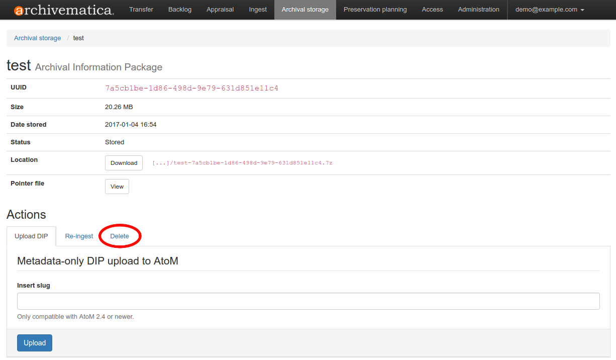 Click delete. When you refresh the Archival Storage tab, the status of your AIP should now read Deletion requested.