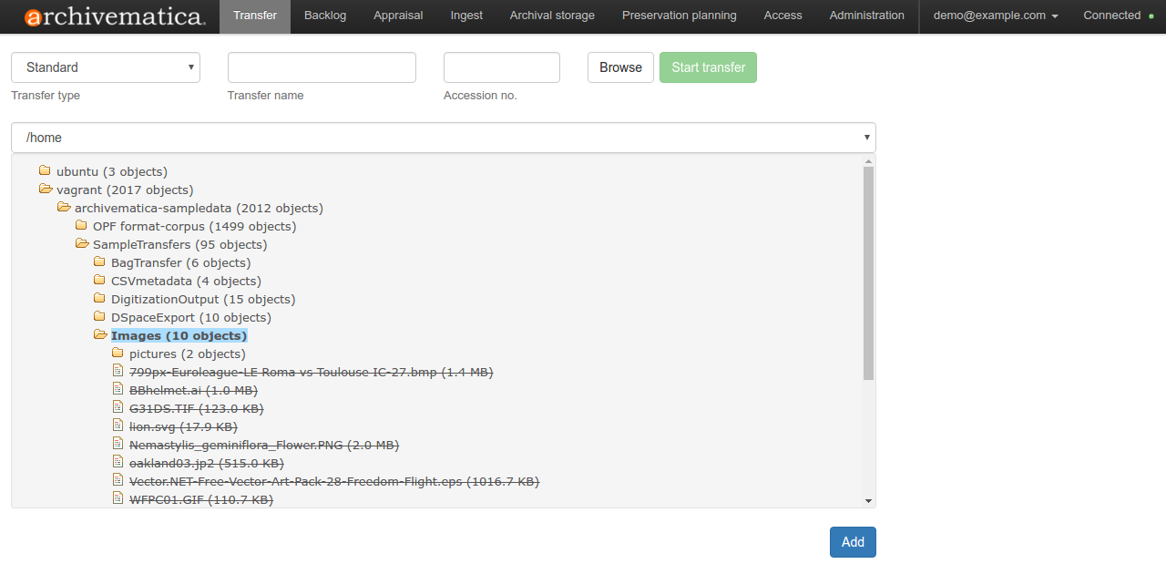 In Archivematica, Transfer is the process of transforming any set of digital objects and/or directories into a SIP. Transformation may include appraisal, arrangement, description and identification of donor restricted, private or confidential contents. The Transfer tab prepares your content for preservation in Archivematica.