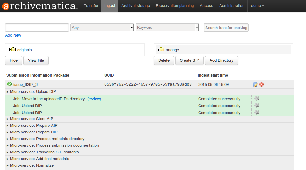 To review the DIP in the dashboard and download individual DIP objects and/or the tab file, click «review»: