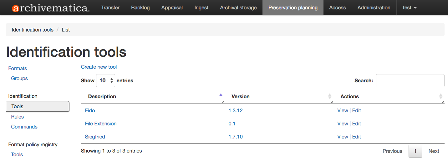 When you install Archivematica, default formats, rules and commands are installed and accessed through the Preservation Planning tab. When you upgrade to a new release of Archivematica, new formats, rules and commands may be added (check the release notes for the specific release to find out). In addition, you can maintain local rules to add new formats or customize the behaviour of Archivematica. Your local changes are maintained if you upgrade your Archivematica pipeline to a new version. Archivematica’s default format policies are maintained by Artefactual. Format policies will change as community standards, practices and tools evolve. If you would like to suggest a different default format policy, consider opening an issue in the Archivematica issues repo.