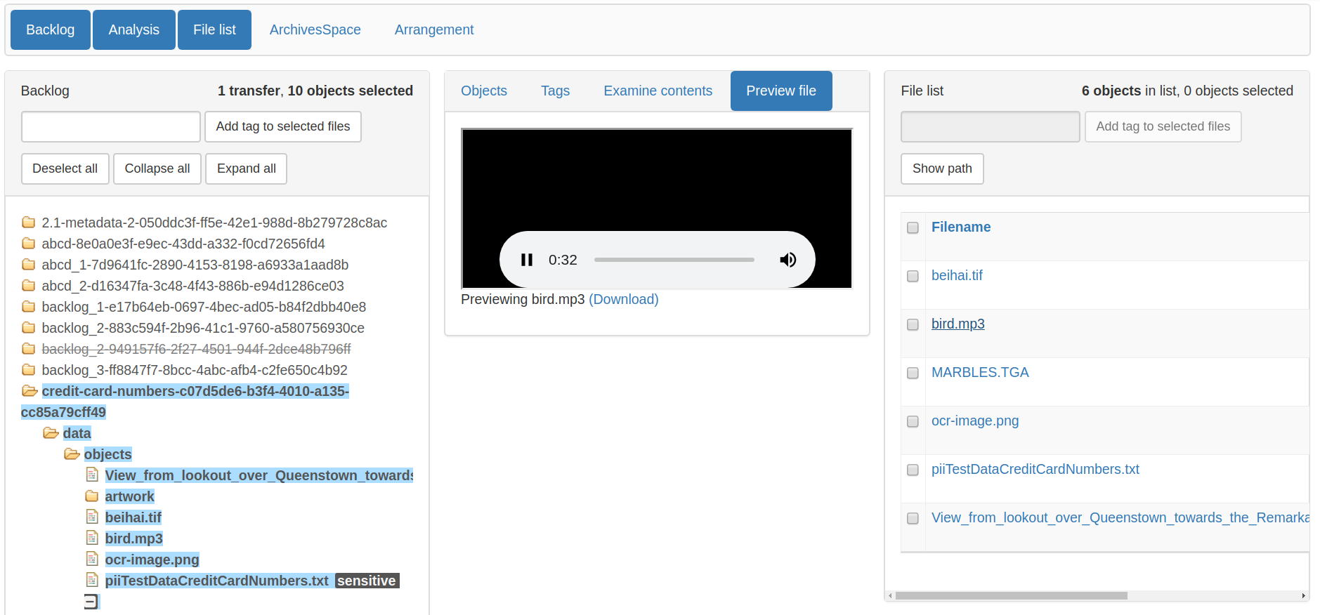 The Analysis pane allows the user to analyse transfer materials in bulk as well as individual files. Files selected in the Backlog pane populate the Analysis pane and can be analyzed using four tabs: Objects, Tags, Examine contents, and Preview file.