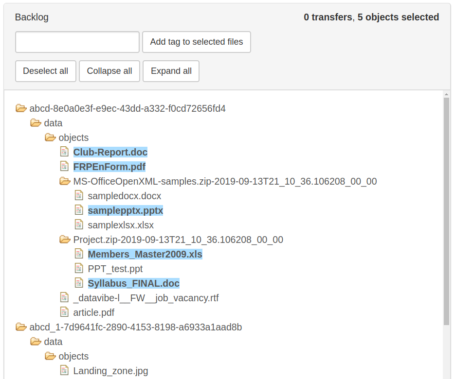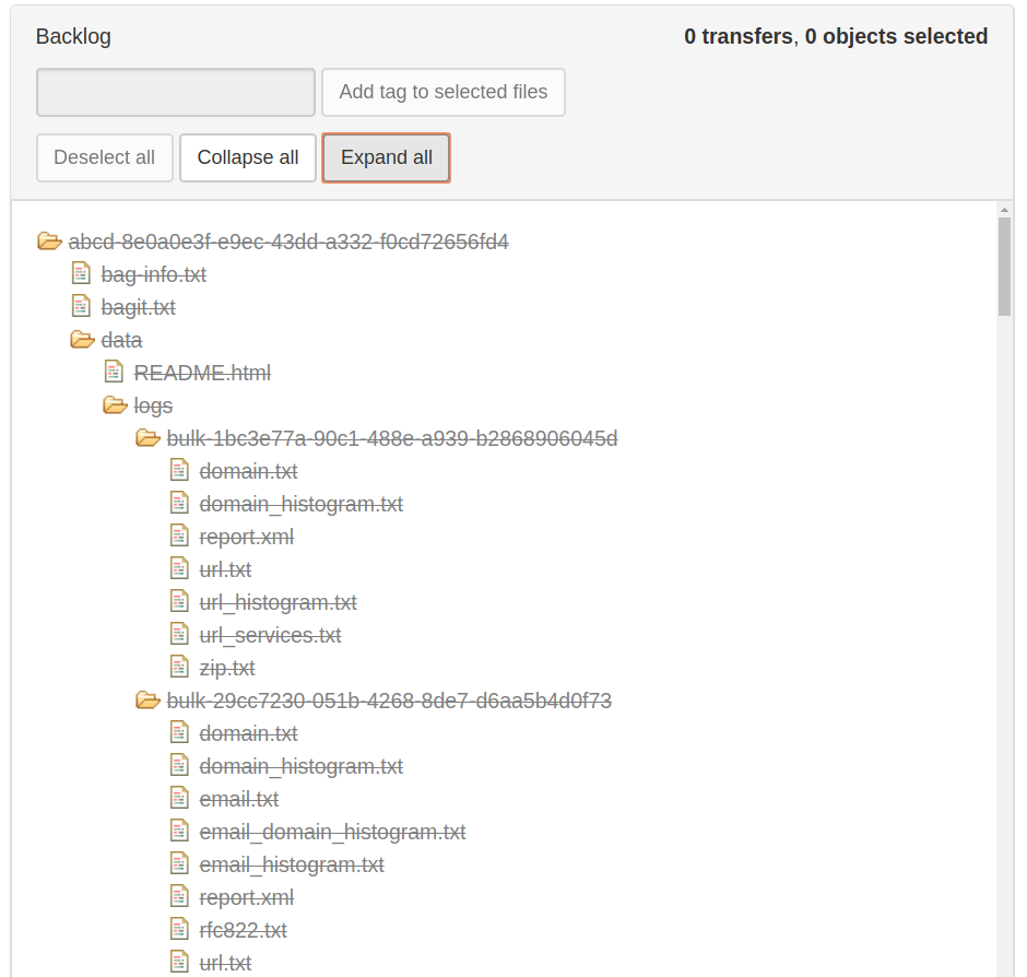 The Backlog pane will display a list of transfer names. You can expand each one by clicking on the yellow folder icon, or by selecting Expand all. Click on Collapse all to collapse all open folders.
