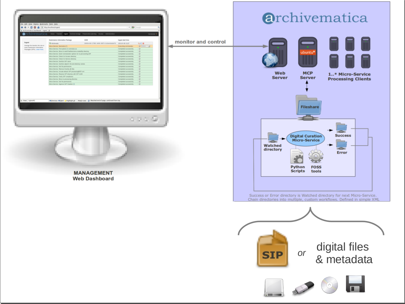 The primary function of Archivematica is to process digital transfers (accessioned digital objects), turn them into SIPs, apply format policies and create high-quality, repository-independent Archival Information Packages (AIP) using METS, PREMIS and Bagit. Archivematica is bundled with AtoM but is designed to upload Dissemination Information Packages (DIP), containing descriptive metadata and web-ready access copies, to any access system (e.g. Dspace, ContentDM, etc.).