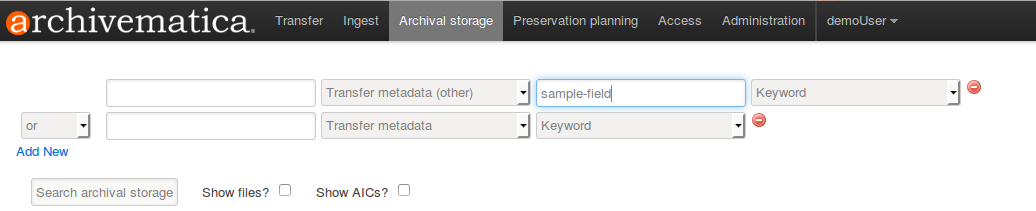 To search the bag (transfer) metadata in the Archival Storage tab:
