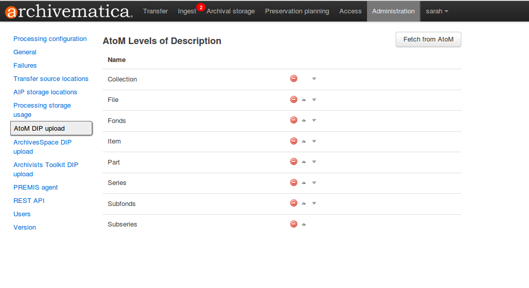 You can fetch levels of description from AtoM so that they can be used in SIP arrange. Click on Levels of Description, then Fetch from AtoM to get an updated list from the AtoM levels of description taxonomy.
