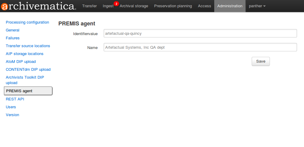 The PREMIS agent name and code can be set via the administration interface.