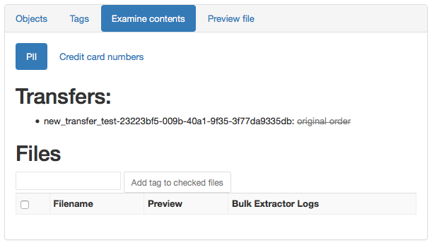 If Examine Contents (using the tool Bulk Extractor) was used during transfer, the Examine Contents tab provides the reports created during this micro-service. This tab includes options for listing files that potentially contain personally identifiable information (PII) or credit card numbers. Examine Contents also includes an option for adding tags to these files.