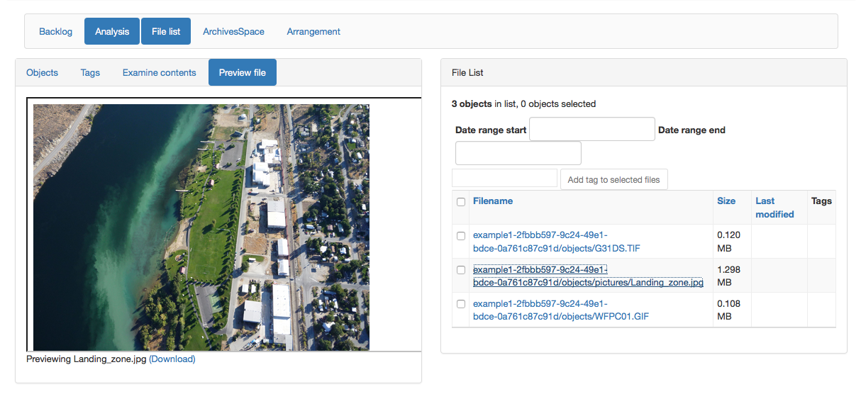 The File List pane is also populated by selecting files in the Backlog pane. File List provides information about the filenames, sizes, dates files were last modified (if available), and any tags that have been added to the selected files.