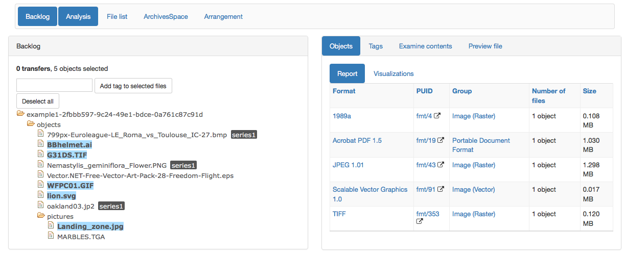 In the Objects tab, information about selected files can be viewed in the form of a report or a visualization. The Report view provides information about the files’ format, PUID, group, number of files, and size. Files can also be analyzed through visualizations with options for representing the total number of files in each format and for representing the total size of files for each format represented in the list.