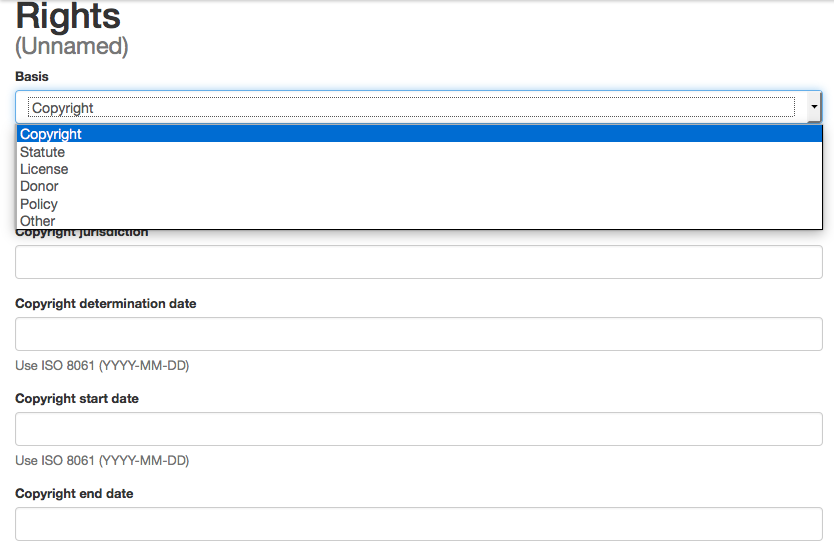 “Edit Rights Metadata” leads to a form for adding PREMIS rights information.