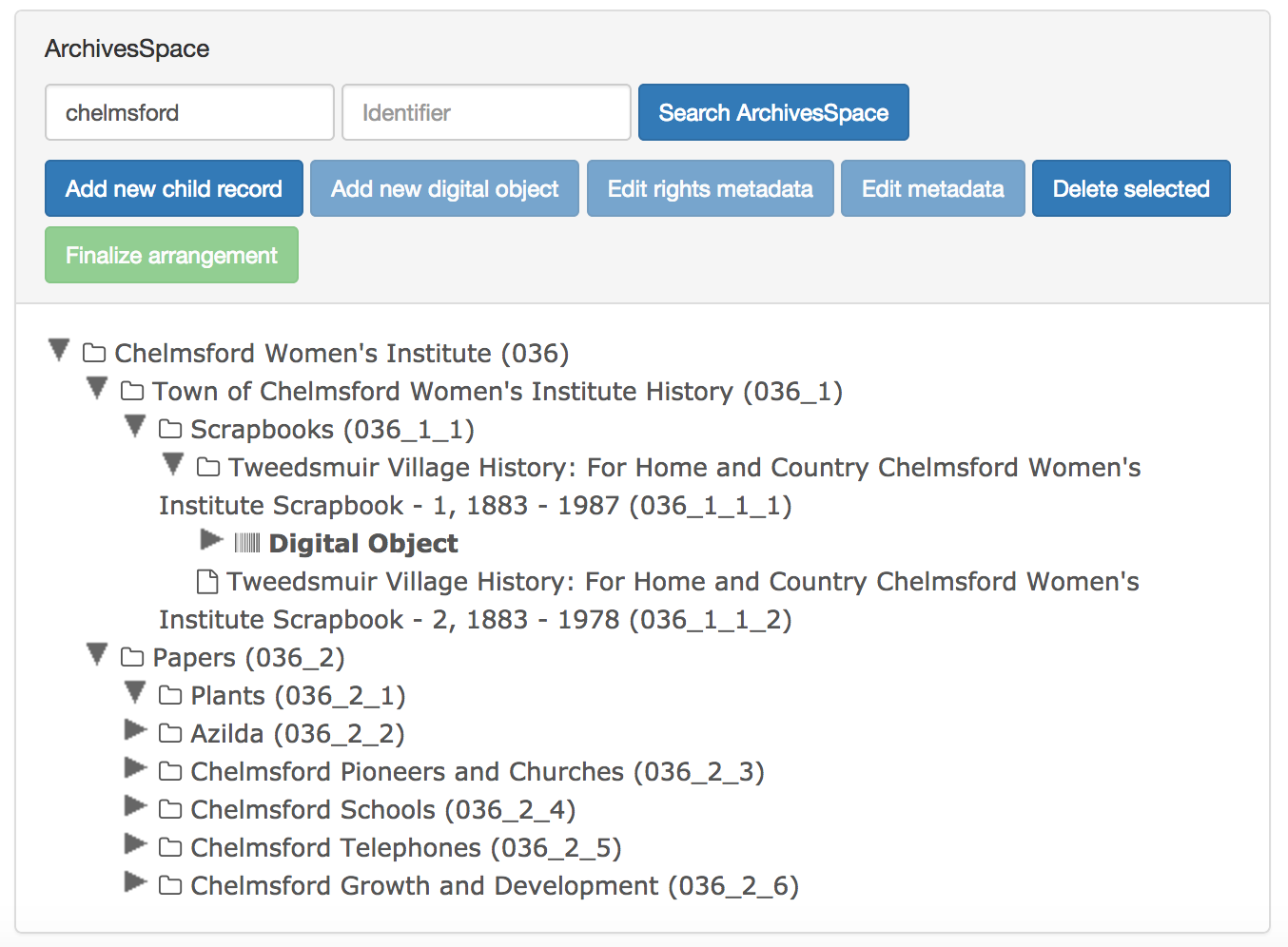 - Once all files have been added and the arrangement has been set, SIPs can be started in Ingest. Select the resource/archival object and click Finalize arrangement. SIPs can be created from ArchivesSpace archival objects at any level of description.