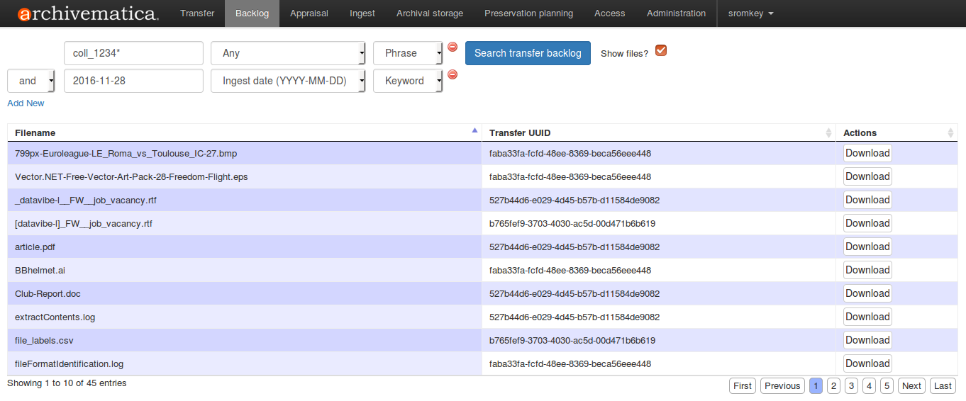 Perform your search using the fields at the top of the screen, adding new boolean operators as desired. Searches can be performed on file name, file extension, accession number, Ingest date or SIP (Transfer) UUID. To search on the name of the transfer, leave the field as “Any”. Wildcards (*) are allowed.