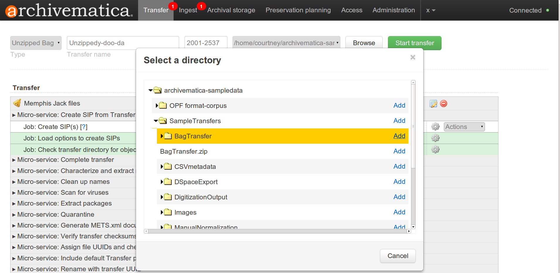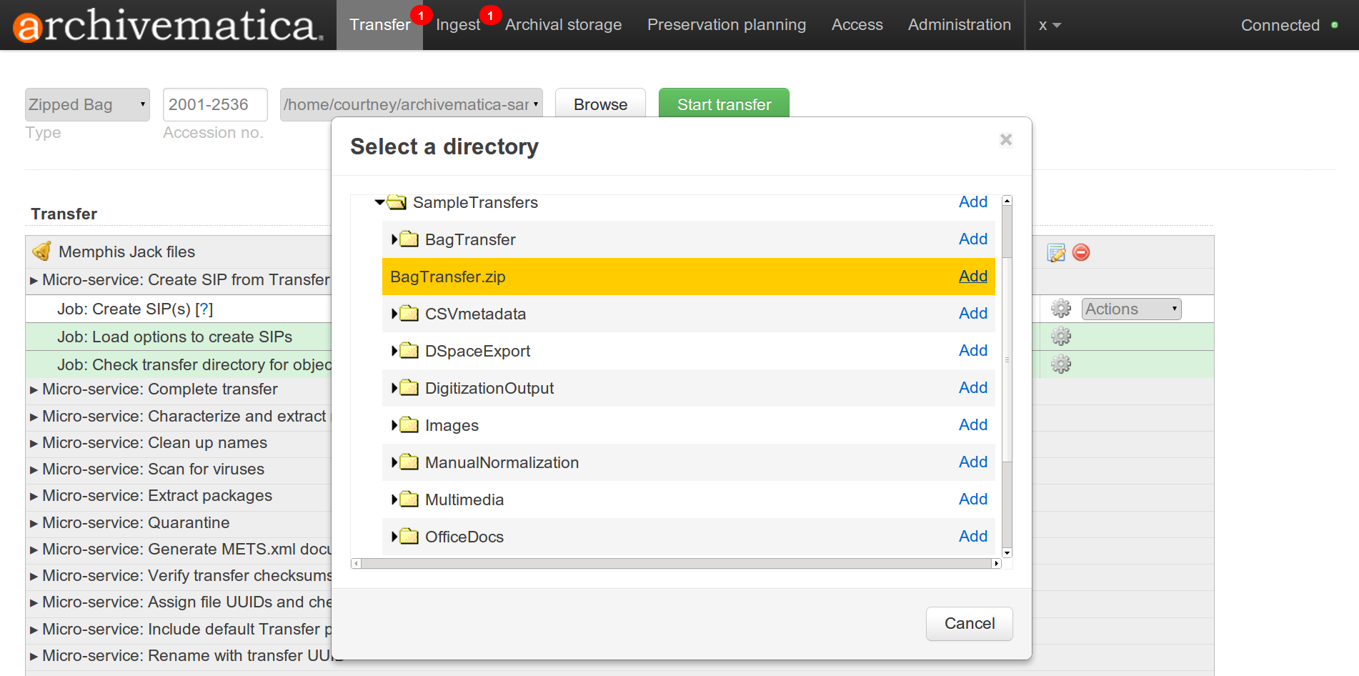 - To ingest a zipped bag, user selects transfer type “Zipped bag” from the dropdown menu in the transfer tab of the Dashboard. Do not add the directory that the zipped bag is in from the browse dialog, just select the zipped file (.zip). Note that you cannot add a new title to the zipped bag transfer, but you can add an accession number.