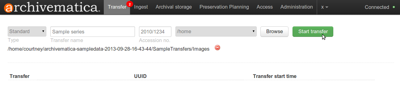 In the Transfer tab of the Dashboard, the user moves digital objects from source directories accessible via the Storage Service into Archivematica. See Administrator manual - Storage Service for instructions on how to set up shared transfer source directories. Once uploaded to the dashboard, transfers run through several micro-services: UUID assignment; checksum verification (if checksums are present); package extraction (i.e. unzipping of zipped or otherwise packaged files); virus checking; indexing; format identification and validation; and metadata extraction.