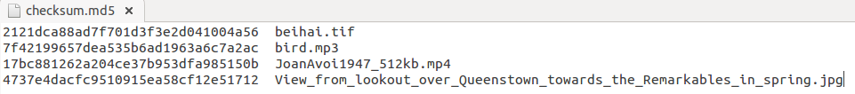 followed by a space, followed by the file name. For example: 7f42199657dea535b6ad1963a6c7a2ac bird.mp3.