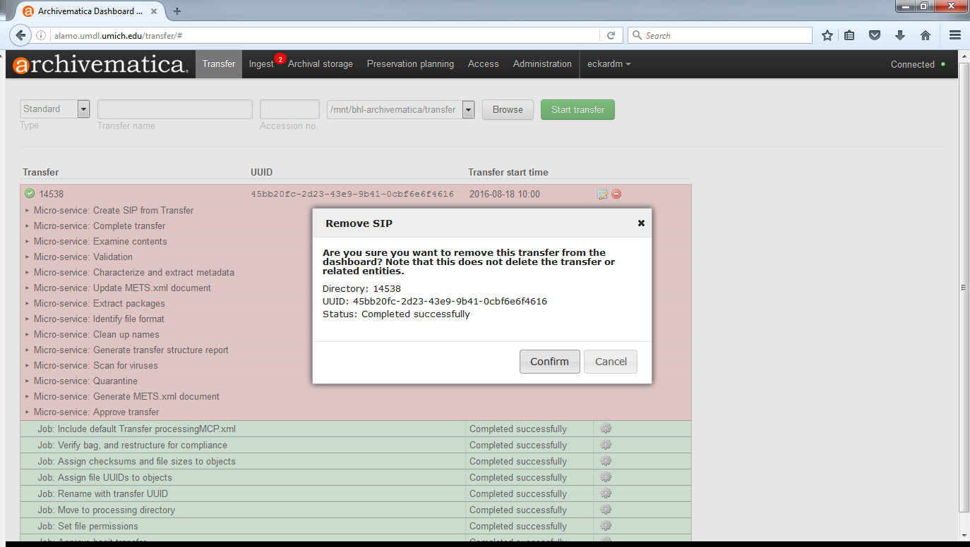 - Ensure that the transfers you want to remove are complete (i.e. sent to backlog or ingest). Note that this feature only works on completed transfers; rejected transfers will have to be removed one at a time.