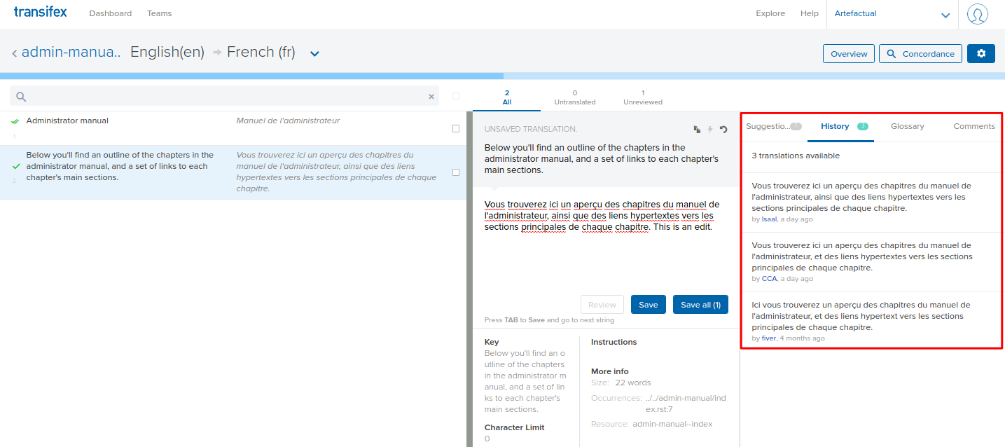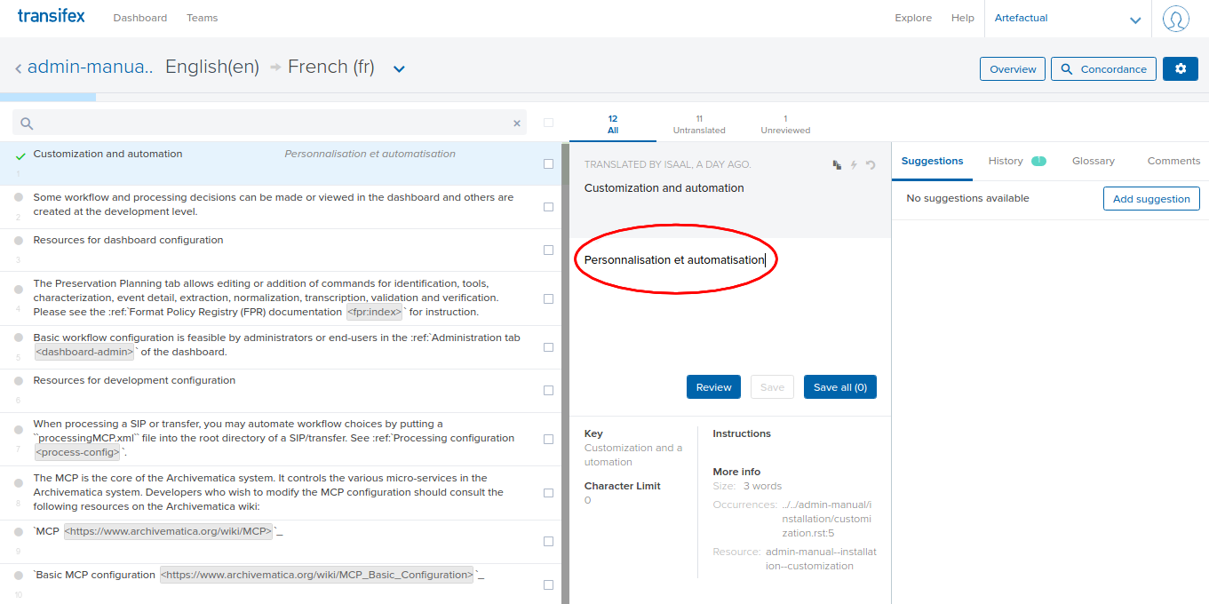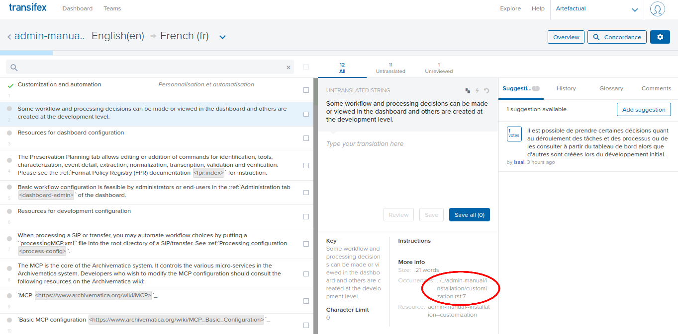 We use Transifex to support the publication of translations. Transifex allows multiple users to contribute translated strings, makes the process faster and easier, and enables Artefactual to publish translations more often. There are multiple Archivematica projects to translate: the documentation, the interface, the website, and the Storage Service.
