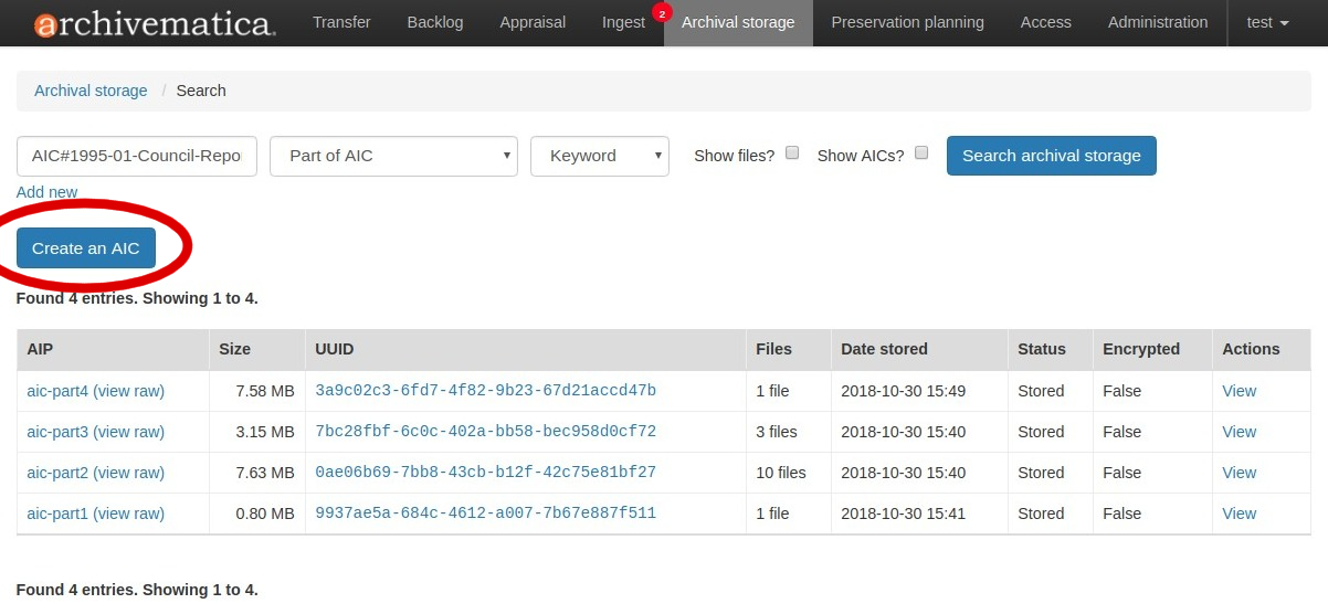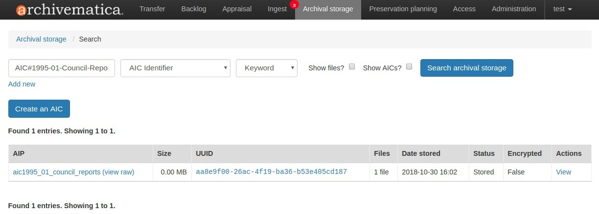If you need to retrieve the AIC or any of the AIPs that make up the AIC, you can do so on the Archival Storage tab.