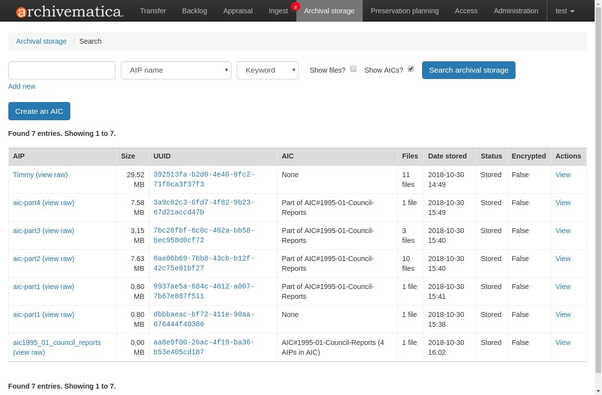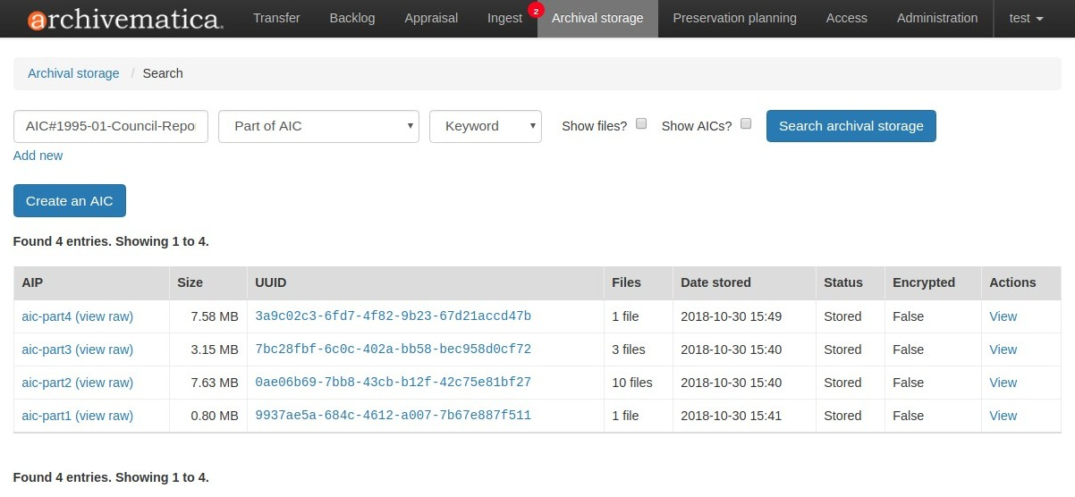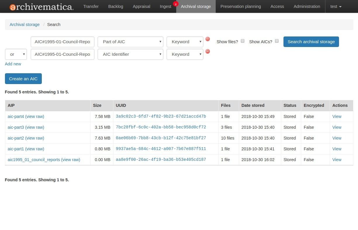 In the above screenshot, note that four of the AIPs are part of an AIC while the last result is the AIC itself. This was a wildcard search, displaying everything currently in Archival Storage.