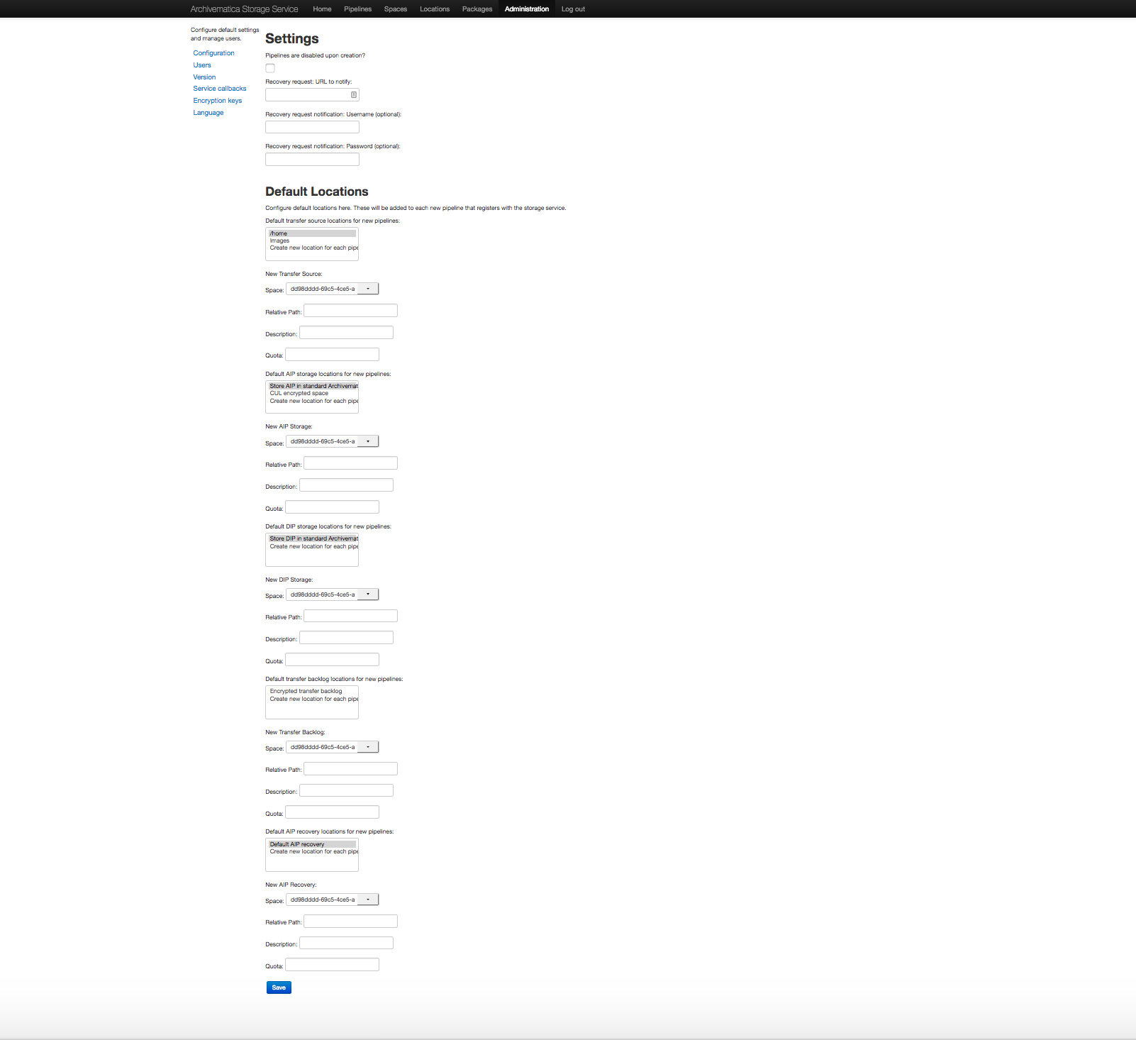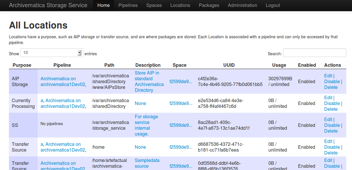 The Archivematica Storage Service allows the configuration of storage spaces associated with multiple Archivematica pipelines. It allows a storage administrator to configure what storage is available to each Archivematica installation, both locally and remote.